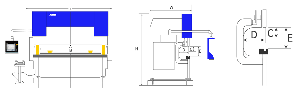 | 型号 | 折弯力 | 折弯长度 (A) | 工进速度 | 折弯速度 | 回程速度 | 立柱间距 (B) | 喉口深度 (D) | 滑块行程(C) | 开口高度 (E) | 主电机 | 机器重量 | 外形尺寸 |